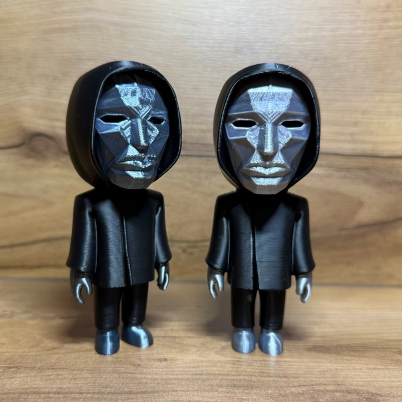 اکشن فیگورهای پلاستیکی از سری محبوب Squid Game، شامل نگهبانهای با ماسکهای دایره، مثلث و مربع، بههمراه شخصیت مرموز Front Man.